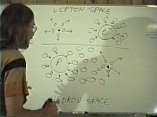 A quark is a collision cell of nuclear strings. The quark is like a big fat quanta that conserves three or more fundamental units of volume, it has some exotic properties. For one thing, it has to keep track of the energy and volume of three or more quanta mixing phases in it at different angles. That's a heck of a lot to keep track of with the simple forms the geometry has been developing up to now. Now, as a big fat quanta with a heck of a lot to keep track of, and a lot of energy, a depleted quanta may see it as something it can mix phases with. The quark disagrees, says "I got my hands full already, and I got more energy then I can find a place to put it. Here," says the quark, "take this and get away from me." The quark does mix phases briefly with the depleted quanta, long enough to shove it away. The process of shoving it away involves flipping both the internal arrows, momentum and angular momentum, and rotating it into the other domain. Actually, it could only flip one arrow and be forced to rotate the quanta's dimensions to prevent a violation in conservation of angular momentum... it depends on how the universe translates energy between domains. For example, is a right-handed hadron left-handed in lepton space? I don't know. Somehow, the quanta is translated between lepton space and hadron space, and it receives an energy boost from the quark in the process. The direction of the translation (lepton --> hadron) or (lepton <-- hadron) determines the polarity of the charge force. The charge force has a long range attraction between oppositely charged particles, as each particle drags space-time towards it from one domain and sources it in the opposite domain. As the opposite charges draw closer together, they start repelling each other, because the quanta they are kicking off start hitting the other particle directly, delivering their energy to each other via the charge couriers. There is nothing "virtual" about these depleted quanta, they are the fabric of space-time. So, the charge force has a long range and short range component, and it is a process of translating energy between the two domains of space-time. In this regard, the surface of a quark is like a magic mirror, or perhaps, a doorway. |