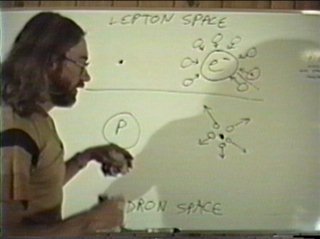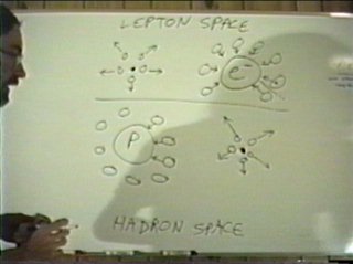 A quark is a collision cell of nuclear strings. The quark is like a big fat quanta that conserves three or more fundamental units of volume, it has some exotic properties. For one thing, it has to keep track of the energy and volume of three or more quanta mixing phases in it at different angles. That's a heck of a lot to keep track of with the simple forms the geometry has been developing up to now. Now, as a big fat quanta with a heck of a lot to keep track of, and a lot of energy, a depleted quanta may see it as something it can mix phases with. The quark disagrees, says "I got my hands full already, and I got more energy then I can find a place to put it. Here," says the quark, "take this and get away from me." The quark does mix phases briefly with the depleted quanta, long enough to shove it away. The process of shoving it away involves flipping both the internal arrows, momentum and angular momentum, and rotating it into the other domain. Actually, it could only flip one arrow and be forced to rotate the quanta's dimensions to prevent a violation in conservation of angular momentum... it depends on how the universe translates energy between domains. For example, is a right-handed hadron left-handed in lepton space? I don't know. Somehow, the quanta is translated between lepton space and hadron space, and it receives an energy boost from the quark in the process. The direction of the translation (lepton --> hadron) or (lepton <-- hadron) determines the polarity of the charge force. The charge force has a long range attraction between oppositely charged particles, as each particle drags space-time towards it from one domain and sources it in the opposite domain. As the opposite charges draw closer together, they start repelling each other, because the quanta they are kicking off start hitting the other particle directly, delivering their energy to each other via the charge couriers. There is nothing "virtual" about these depleted quanta, they are the fabric of space-time. So, the charge force has a long range and short range component, and it is a process of translating energy between the two domains of space-time. In this regard, the surface of a quark is like a magic mirror, or perhaps, a doorway. |