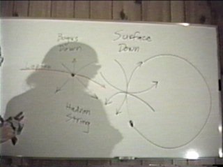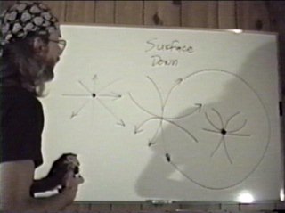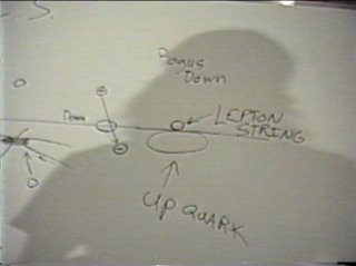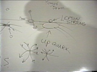 think the graviton is a spin 2 particle.) In the lower diagram I attempt to show how all the vector quantities of the strings tend to cancel in the surface down quark. In the up quark with only three strings, cancellation of the string vectors is not possible. The up quark might be thought of as having a spin orientation which binds it in hadron space. The surface down quark cancels this property out, it doesn't spin either way, so it hovers between the domains of lepton space and hadron space. The bogus down quark cheats. Its an up quark with a pinned lepton string. Here the boundaries of lepton and hadron space are forced into contact via conservation laws. Pressing strings from opposite domains creates the same kind of gateway to support gravitational radiation. Remember, gravity doesn't warp space-time, charge does. Gravity is a corpuscular radiation of opposite handedness. Gravitational radiation occurs on demand to supply the charge force of a particle with energy. Gravitational radiation provides the fuel to the nuclear motor which pumps charge. |