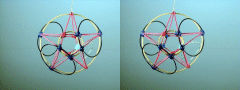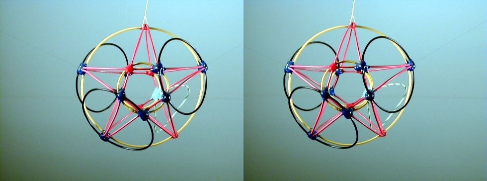 | This is pretty much the solution set for N5. You can modify any of the P5 shells by pinning 5 more radical strings to them to get the proper number of down quarks, so they would also have to be considered as viable solutions. There are an extremely limited number of solution sets for a five particle shell, and its an important shell, so it is no coincidence I have concentrated so much effort on them. I have successfully stacked this shell with (P5-42P) to arrive at a B10 nucleus which demonstrates a linearized orbital responsible for the semiconducting properties of boron, and this is my best evidence that these nuclear modeling techniques really work as advertised. The principal isotope of beryllium (Be9) and the second isotope (20% abundance) of boron (B10) use five neutrons. Note that pulling off one of the filler circlets (black loops) and pinning three more radical strings will yield N5-44P, which may be required for shell stacking of Beryllium 9. Pulling off all of the filler circlets and substituting 10 radical strings at the poles (or one lepton string at each pole pinned to each of the five polar quarks in a "flower petal" arrangement) yields N5-3(10)P. This N5-3(10)P arrangement is easy to stack with P4-30P, P4-30, and P4-42 and may be appropriate for the primary isotope of beryllium 9. (I'm a bit annoyed, though, I've worked hard to fill my shell models, using pinned strings only where they could not be avoided. I'm starting to wonder if nature is even less stringent in its nuclear regimen than I have been. In the act of stacking shells, nature may not hesitate to drop filler circlets and substitute pinned strings to achieve a stable shell stacking arrangement. If that turns out to be so, then I've been working too hard.) |