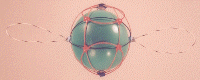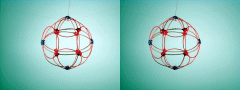 | The Proton Shell of 4 pins a single radical string for the second degree solution. The six structural loops form a cubic structure with one loop on each face of the cube. I have not modeled a stacked set of shells of the beryllium atom as yet. It should stack with the N5-41P shell to produce beryllium 9. N5-41P has an unusual quark distribution. In spite of the fact that I have found four different solutions for the P4 shell, the three solution sets below have similar symmetrical quark distributions. Only this solution is a bit lopsided in its quark distribution, and may represent the best fit with N5-41P in nature. Nature would tend to then favor stacking this shell with N5 over all the other P4 solutions. Beryllium 10, on the other hand, would have an N6 shell, which would clearly stack better with the charge-symmetry of the P4 shells given below. |